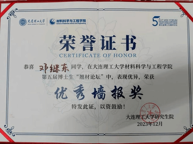 邓继东同学表示:“通过参加大连理工大学举办的第五届博士生‘翘材论坛’,拓展了学术视野,了解到材料交叉学科的知识,加深对材料科学和应用的体会和认识。另外,学术报告的经历提升了我的演讲表达能力,也加强了思维逻辑能力,经过现场各位专家的专业点评,我也发现了自己在科研方面的深入思考还存在诸多不足,这也指引我不断继续努力的方向。最后,感谢举办方大连理工大学本次论坛的热情邀请,祝愿论坛越办越好。同时,也感谢厦门大学材料学院领导的推荐以及导师张金宝教授对我细心指导和大力的支持。路漫漫其修远兮,吾将上下而求索。”