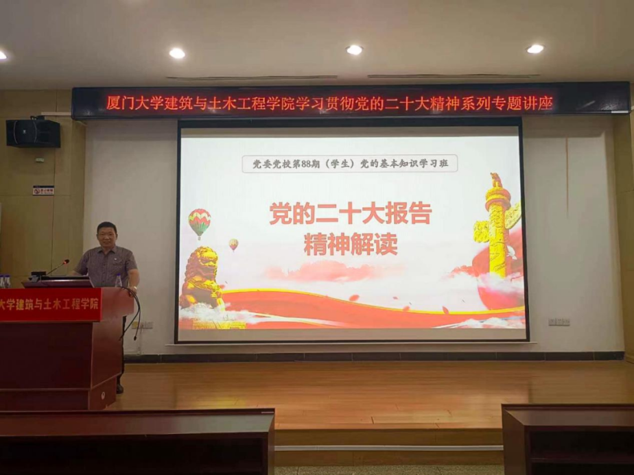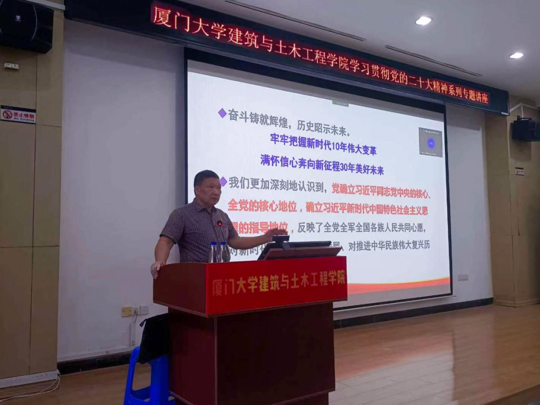 10月22日,厦门大学材料学院、建筑与土木工程学院、化学化工学院联合举办的专题讲座《党的二十大精神解读》在曾呈奎楼118报告厅举行。该讲座由厦门大学关工委副主任、马克思主义学院苏劲教授主讲,通过线上线下相结合的形式开展,参会对象为三个学院的师生党支部书记、支委,学生党员以及第88期党校学员。