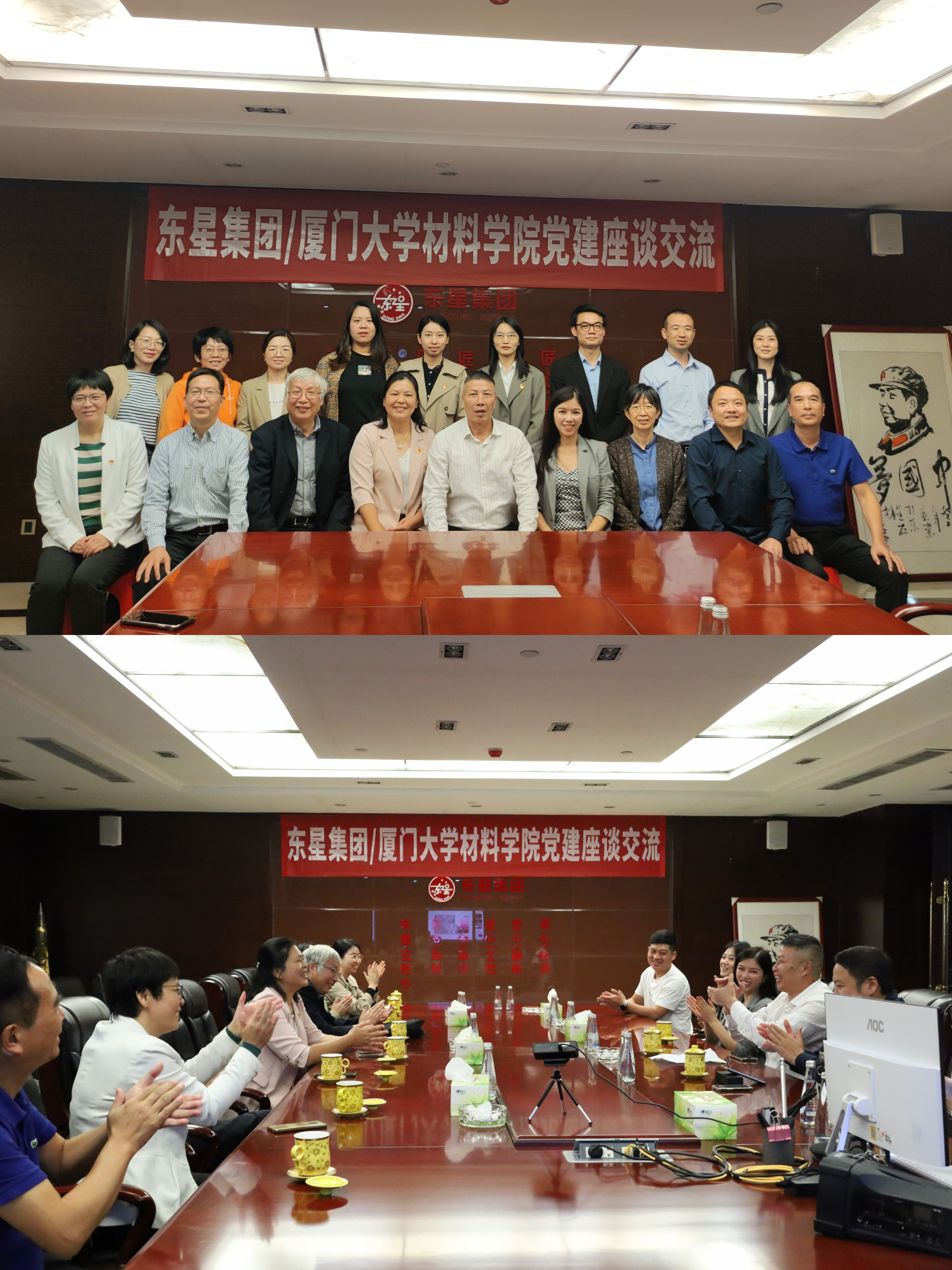 座谈会上,东星集团蔡金星董事长对材料学院一行表示热烈欢迎,重点介绍了集团的创业历史,经营理念和企业文化以及转型升级之路。蔡董事长表示,习近平总书记在二十大报告中强调“绿水青山就是金山银山”的理念,是东星集团必须牢固树立的经营准则,能有幸与材料学院的专家学者一起畅谈交流,并以此次共建为出发点寻求合作,协同发展,以实际行动践行报告精神,意义非凡。黄兆君副书记表示,二十大报告提出了中国式现代化的概念,创建协同创新产学研平台,与企业共谋绿色低碳新材料是材料学院一直努力的方向。今天的座谈交流只是开始,材料学院今后将充分发挥高校专家团队的科研优势,在人才培养、科学研究、文化传承上更好的落地,服务地方企业。会上,东星集团代表与周忠华教授、宓锦校教授、黄雅熙副教授等老师就如何更有效推动科技创新和产学研合作;如何更好的满足市场的需求,解决企业技术发展瓶颈;围绕人才培养目标,学生实践基地等问题进行了深入探讨。最后,双方明确,将以此次活动为契机,以党建为纽带,进一步加强双方基层党组织间交流与沟通,以党建联动系纽带,合作共赢创未来。