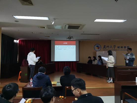 首先,随着主持人范乃元和李旺琴介绍完参赛规则,比赛正式开始。参赛的同学一共分为10组,每组队员积极参赛、主动抢答,题目分为选择题和和填空题。通过第一轮的必答题初赛的选拔,积分前六的队伍进入了下一轮抢答题的角逐。在这一轮角逐中,比赛进入了白热化阶段,当遇到一些模棱两可的回答时,主持人主动请示两位老师对得分的评判,于是在两位老师的正确指导之下,比赛进入了高潮阶段——决赛环节。