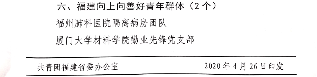 4月26日,共青团福建省委公布2020年“福建向上向善好青年”评选结果,我院勤业先锋党支部获评“福建向上向善好青年群体”。