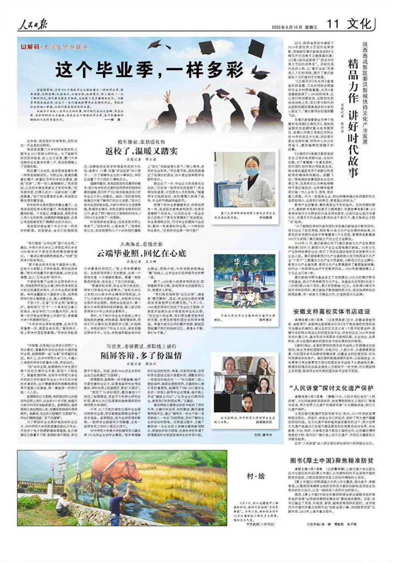 《人民日报》2020年6月10日以“这个毕业季,一样精彩”为题,报道了我院2017级硕士生吴洁茹疫情防控期间返校心路历程——《返校了,温暖又踏实》,并配发吴洁茹在实验室照片。学校、学院为迎接学生返校,做了充分的准备和周密的安排,为每个返校学生准备了防疫大礼包,安排老师和志愿者到车站、机场等地方接站,确保学生返校工作万无一失,既有原则,又有温度,为毕业生营造了良好的氛围环境和美好回忆。