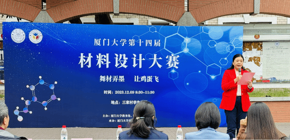 2023年12月9日,厦门大学第十四届材料设计大赛在三家村广场顺利举办。材料设计大赛是由厦门大学教务处、厦门大学材料学院主办,材料学院团委承办。出席本次大赛的嘉宾和评委有材料学院党委副书记黄兆君老师、姜源教授、孙亚楠副教授、陈江溪副教授、李淑星副教授、李烨助理教授、杨丽助理教授、团委书记石林伟老师、辅导员林锦昊老师。本届大赛共吸引了来自20个学院105支队伍的300多位同学报名参与,在提高同学们动手能力,加深不同专业的学生对材料加工与应用的了解的同时,也激发了学生对材料科学的兴趣,为青年学子搭建了一个展示创新思维和动手能力的舞台。