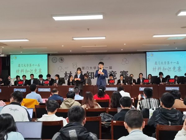 厦门大学第十一届材料知识竞赛决赛于2023年12月10日于材料学院圣诺楼201举办。材料知识竞赛是由厦门大学教务处、厦门大学材料学院主办,材料学院团委承办。出席本次活动的嘉宾和评委有材料学院党委副书记黄兆君老师、李磊教授、黄雅熙副教授、林乃波副教授、林杰助理教授、团委书记石林伟老师、团委副书记蔡胜男老师、辅导员林锦昊老师。本着“造好材料,筑中国梦”的宗旨,本次活动在考察材料学科相关知识的同时,也展示了材料相关学科的魅力与潜力,向同学普及了更多材料相关的常识。