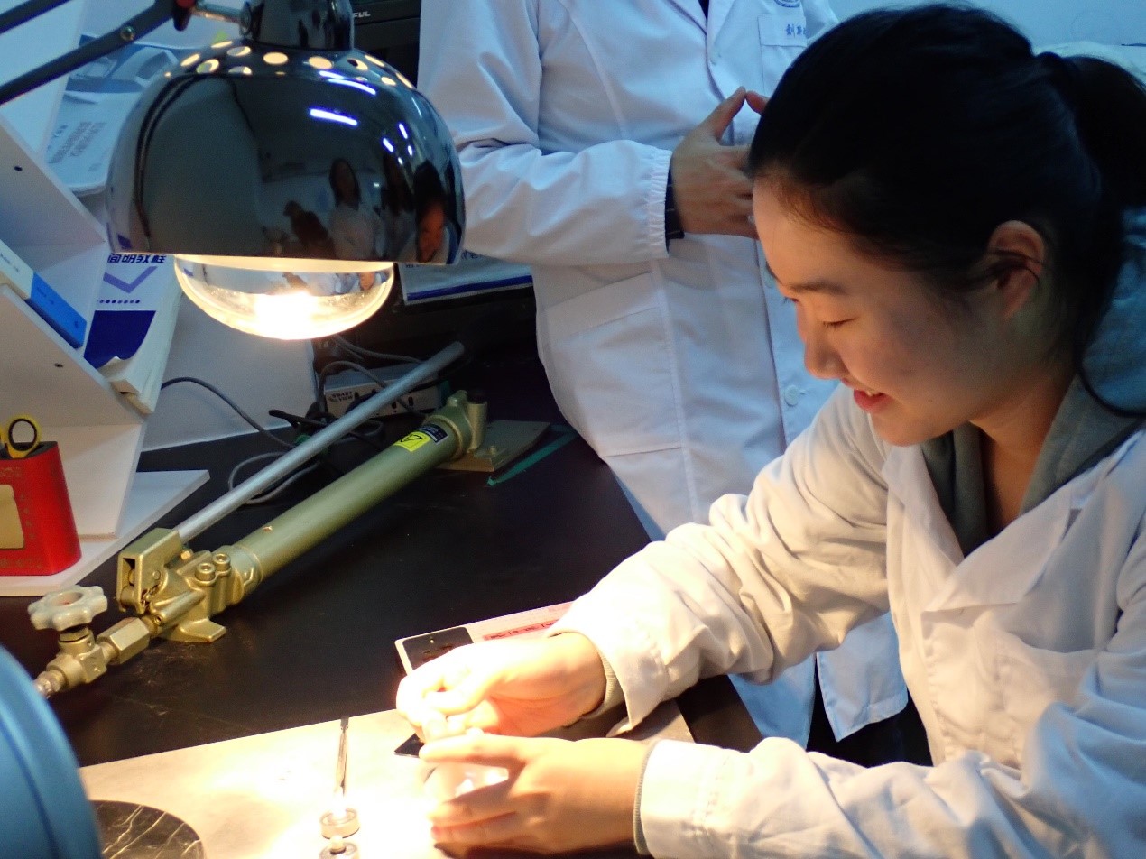 虚拟实验室的体验结束后,同学们又来到了科学楼411红外光谱实验室。在这里,同学们在两位老师的指导下,分小组完成了从制样、压片到测试的完整的红外光谱分析流程。