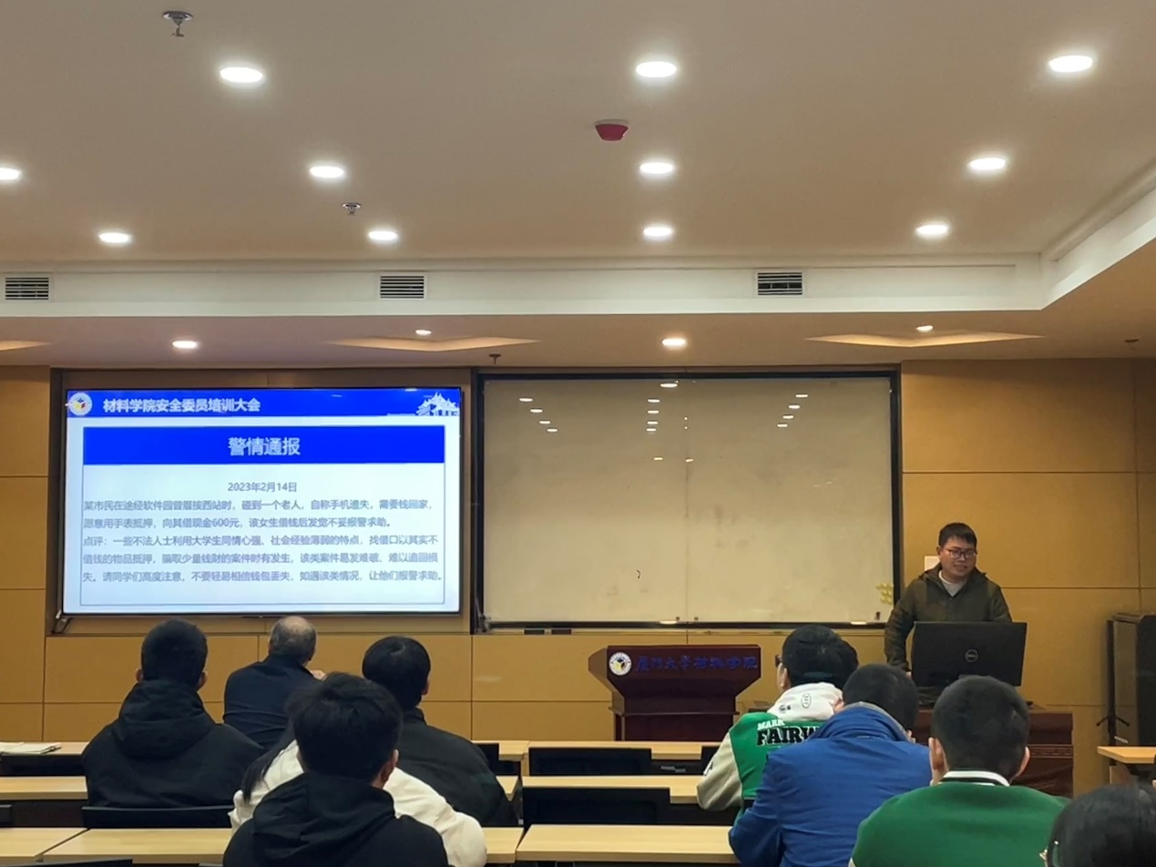 为进一步提高同学们的防诈水平,加强同学们的反诈意识,12月25日下午,材料学院于多媒体教室举办安全委员培训大会,学院党委副书记马兆海、团委书记石林伟、团委副书记蔡胜男、辅导员林锦昊出席。培训会由蔡胜男老师主持,全院安全委员到场参加学习。