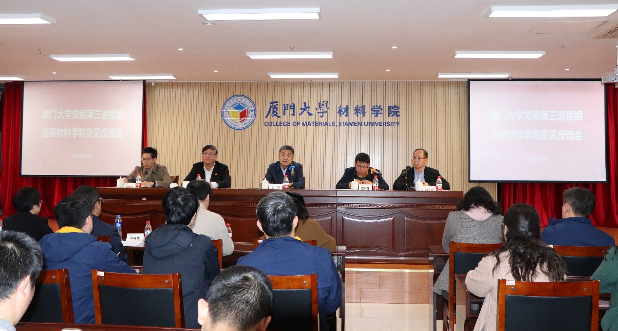 2024年1月5日下午,厦门大学党委第三巡视组在材料学院新楼201报告厅召开巡视材料学院意见反馈会。校党委副书记、纪委书记、国家监委驻厦门大学监察专员全海,第三巡视组组长蔡郑伟,副组长毛通文,校党委巡视工作领导小组成员、巡视办主任洪真裁,学校纪检监察机构第二纪检监察室主任曾惠容,组织部门代表、组织部干部监督办公室主任陈霄巍出席了大会。大会由材料学院党委书记刘立荣主持,学院党政领导班子成员、在职教职工参加了会议。