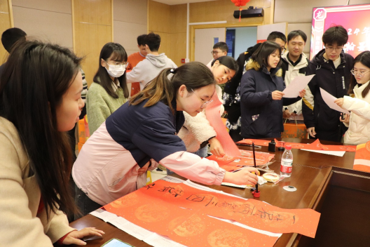 在“翰墨书香送祝福”环节,学院特意准备了笔墨纸砚,鼓励同学们在春联上挥洒才华,书写下对新年的美好祝愿,无论是带回实验室还是宿舍,都能增添一份节日的喜庆。同学们纷纷走上台前,用一笔一划勾勒出对未来的美好期许。