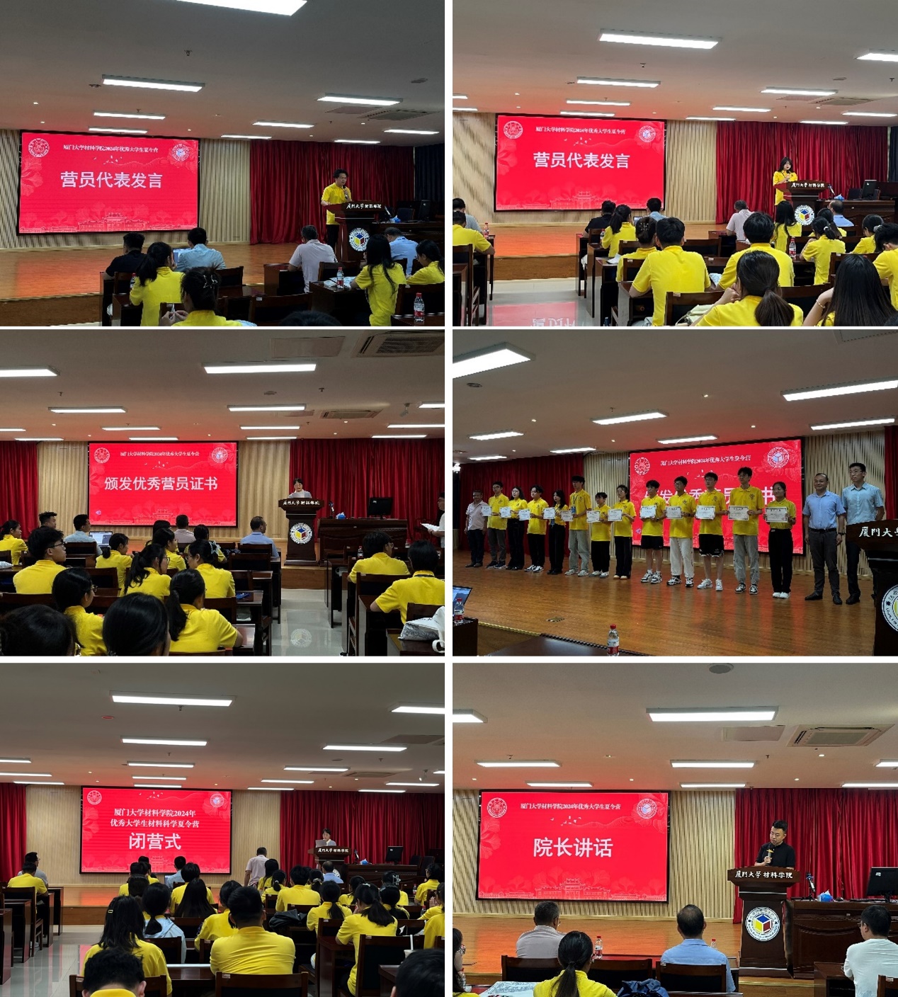 7月11日,夏令营闭营式在圣诺楼201报告厅举行。材料科学与工程系副主任杨水源、生物材料系副系主任林乃波和材料学院张志昊副教授三位老师为优秀营员代表颁发荣誉证书。营员代表上台发言,他们从本次参营经历谈了自己的体会以及收获,纷纷表达了对未来研究生生活的憧憬与向往,并表示本次参营受益良多。材料学院副院长李思维教授做总结发言,他向为本次夏令营筹备工作付出努力的师生表示感谢,肯定了营员们的优秀表现,并寄语营员们要继续努力、奋斗不止,并希望他们能够在未来的科研道路上永葆初心、取得更加优异的成绩,期待明年与大家再次相约厦园。
