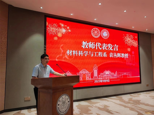 接着,教师代表材料科学与工程系袁丛辉老师从学长、导师和家长三个角度与新生们做分享:作为学长,希望大家多向师兄师姐学习,懂得“吃亏是福”,学会科研赞美,崇尚科研合作;作为导师,大家要珍惜师生每次沟通交流的机会,快速成长,同时导师也期待成为大家的朋友和科研上的战友;作为家长,叮嘱大家特别要平平安安,特别是实验安全,要学会正确评估每一件事的风险与后果。他寄语同学们在前行道路上从容应对苦难、谦逊看待成功,在材料学院度过一个充实、快乐、有意义的研究生生涯。