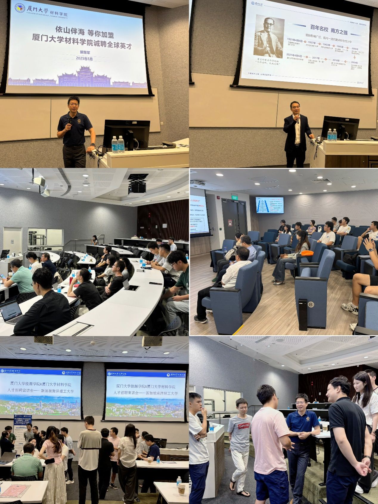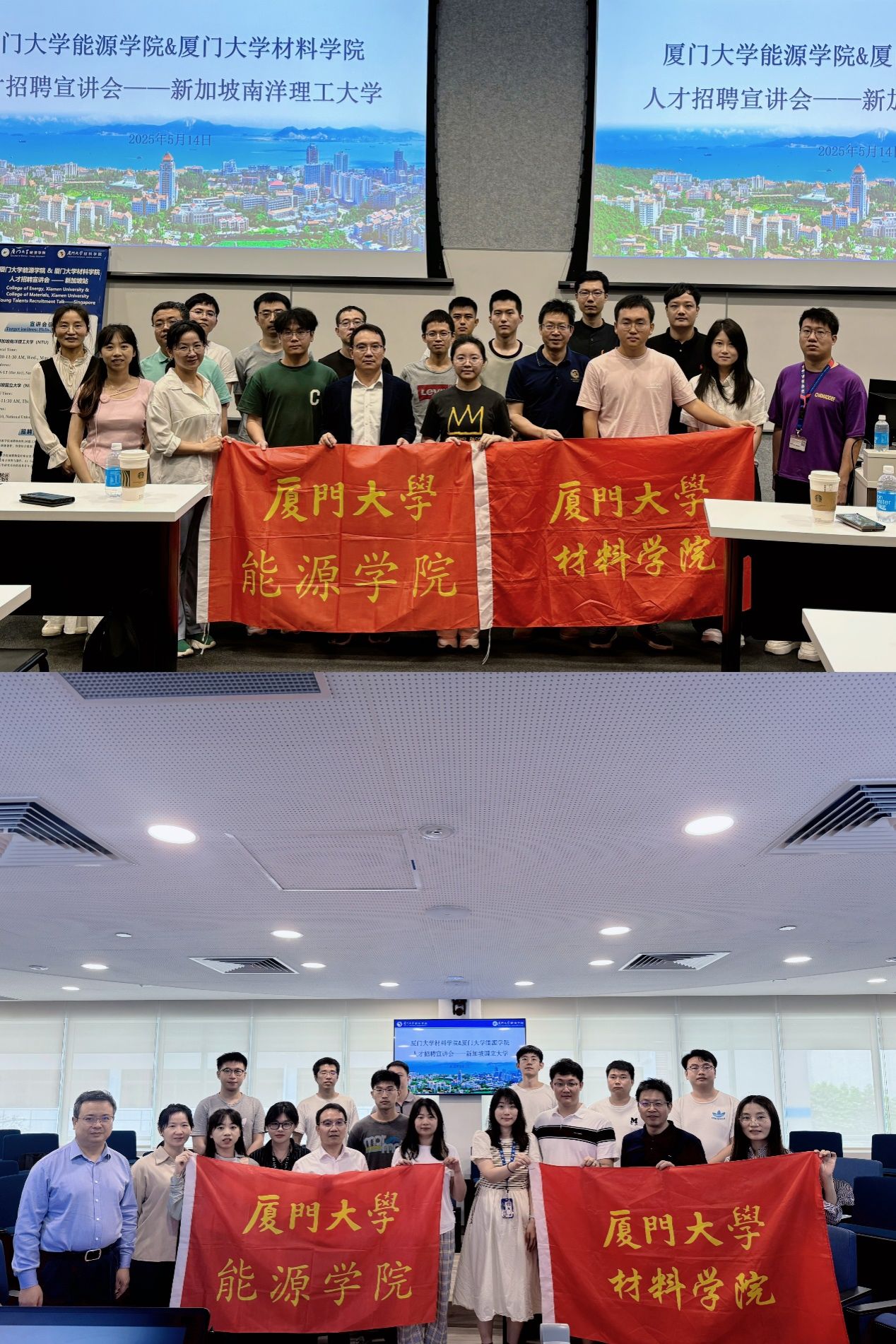 为延揽海外优秀人才,提升学科竞争力,2025年5月14日至15日,厦门大学材料学院、能源学院联合赴新加坡开展引才宣讲。宣讲活动在新加坡南洋理工大学、新加坡国立大学举办,由材料学院院长解荣军教授和能源学院主持工作副院长郑志锋教授带队。