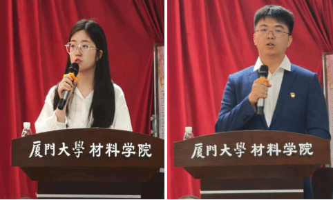 厦门大学五四红旗团支部标兵2022级博士生团支部书记夏永吉、材料学院2025年“学术之星”2022级本科生张家玮作为学生代表发言。夏永吉分享了学院团队合作帮助她多元成长的温暖集体记忆,并号召同学们"做科研要心怀国之大者"、与国家需求同频共振。张家玮表示学院师生悉心帮助使他从迷茫者蜕变成追梦人,激励自己不断在科研、“互联网+”创新创业大赛、"2+8"朋辈导师和"囊萤星火"青年讲师团等方面发光发热。