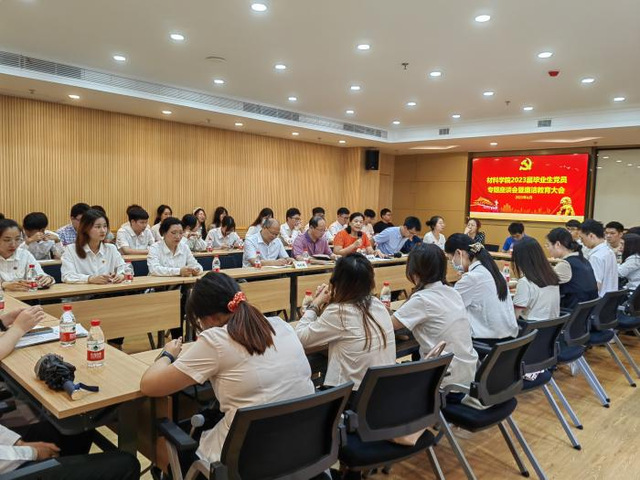 6月20日,材料学院2023届毕业生党员专题座谈暨廉洁教育大会在材料学院多媒体教室举行。学院党委书记刘立荣、副书记马兆海、团委书记石林伟、副书记蔡胜男出席会议,全体毕业生党员参加大会,会议由学院党委副书记黄兆君主持。