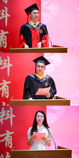 接着,2019级博士生叶伟彬,2019级本科生吴嘉坤作为毕业生代表先后上台发言,在校生代表2021级硕士研究生王茜茜也为毕业生们送上真挚的祝福。叶伟彬表示,在学校的求学时光,让每一个厦大材料人都打上了“爱国、革命、自强、科学”的精神烙印,也让大家更清醒地不忘来时路,奋进脚下路,眺望未来路,共勉“红专并进,永远在路上”。吴嘉坤深情回顾了自己在厦大奋斗充实的四年,他说厦门大学材料学院是大家梦想启航的地方,“料成材、材成器、器好用”,愿有朝一日,大家皆能成为一块对国家有用的好材料。王茜茜代表师弟师妹们感谢师兄师姐亦师亦友的帮助和指导,祝福全体毕业生们前程似锦、未来可期,并表示会像他们一样认真踏实、勤勉刻苦,以实际行动和优异成绩,为社会和学院的奉献青春和力量!