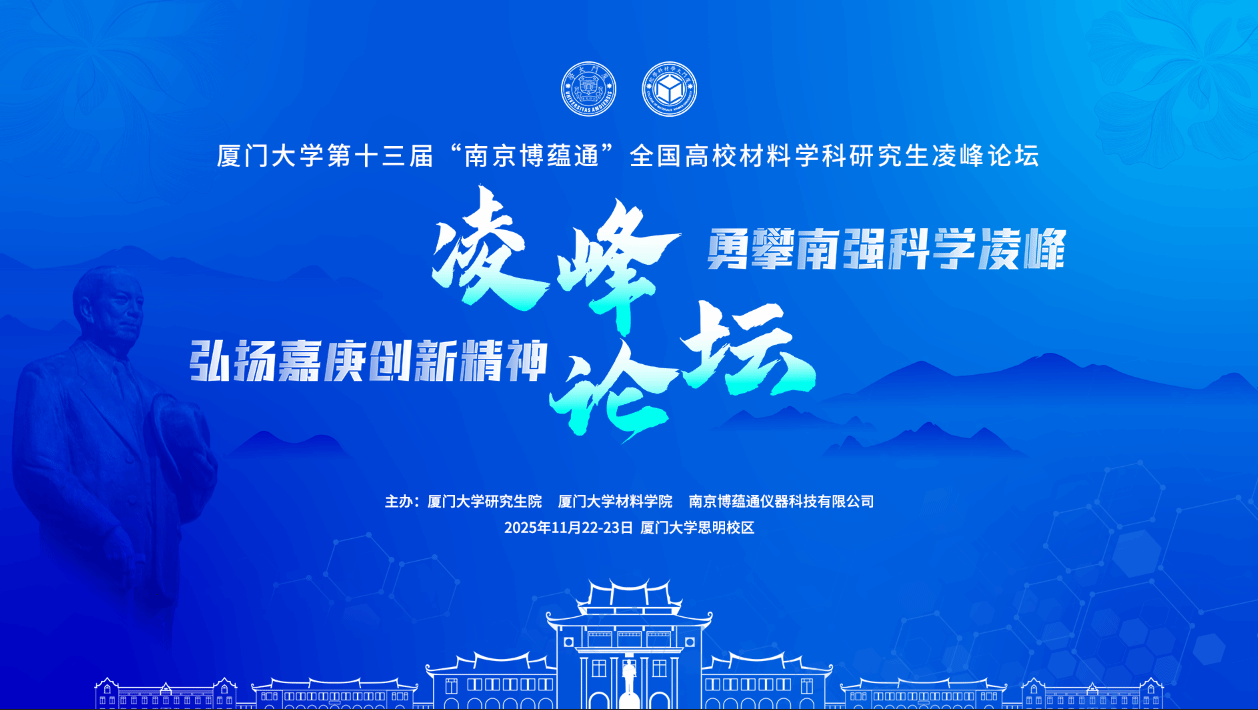 为深入学习贯彻党的二十大和二十届四中全会精神,促进人才培养和学科交流,拓宽高校材料学科研究生学术视野,启发创新思维,涵养使命担当,厦门大学研究生院、厦门大学材料学院及南京博蕴通仪器科技有限公司于2025年11月22日至23日联合举办第十三届“南京博蕴通”全国高校材料学科研究生凌峰论坛。
