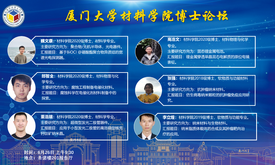 2023年6月26日,第五期材料学院博士生论坛在圣诺楼201报告厅举办。本论坛旨在激发和培养博士研究生的创新精神、活跃学术氛围、促进优秀研究成果的分享交流,拓展学术思维及促进学科间的交叉融合。本期论坛共邀请6名博士生参与汇报,并邀请到张金宝教授、魏湫龙副教授、刘安华副教授做评委,对报告活动内容进行点评指导。