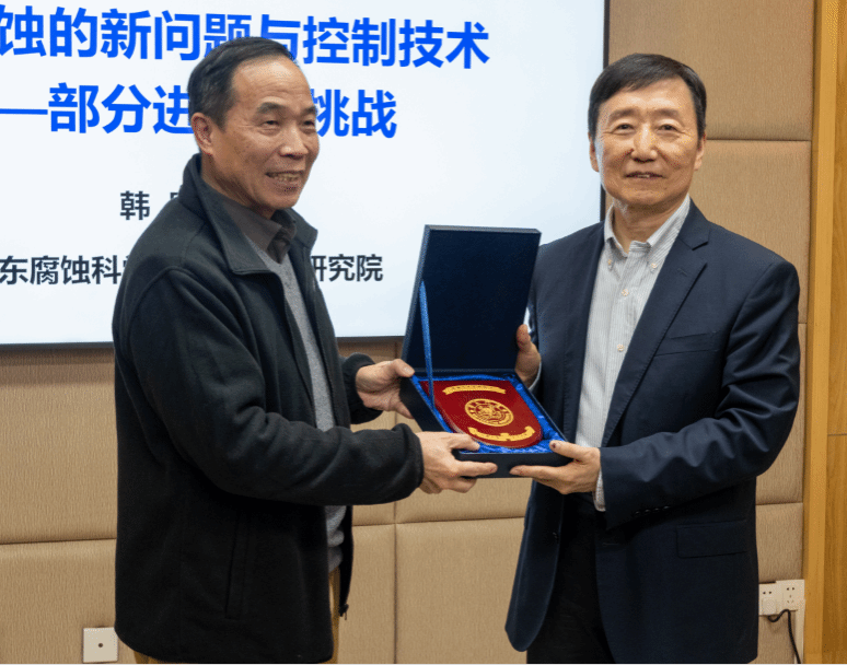 讲座最后,林昌健教授对报告内容进行了总结,感谢韩恩厚院士为厦大师生带来了一场高水准的学术盛宴。他指出,韩院士的报告不仅展现了海洋腐蚀领域的学术前沿,更体现了科学家面向国家需求做科研的使命担当,对学院相关方向的科研与人才培养具有重要的指导意义。随后,林昌健教授为韩院士颁发了“南强讲座纪念牌”。