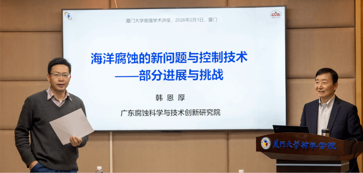 2026年2月1日下午,厦门大学第1397期南强学术讲座在材料学院圣诺楼308会议室成功举办。本次讲座特邀中国工程院院士、广东腐蚀科学与技术创新研究院院长、世界腐蚀组织(WCO)主席韩恩厚教授,作题为“海洋腐蚀的新问题与控制技术——部分进展与挑战”的学术报告。讲座由材料学院院长解荣军教授主持,材料学院师生、化学化工学院、土木与建筑学院部分老师以及厦门市腐蚀与防护工程学会成员单位代表近50人参加了讲座。