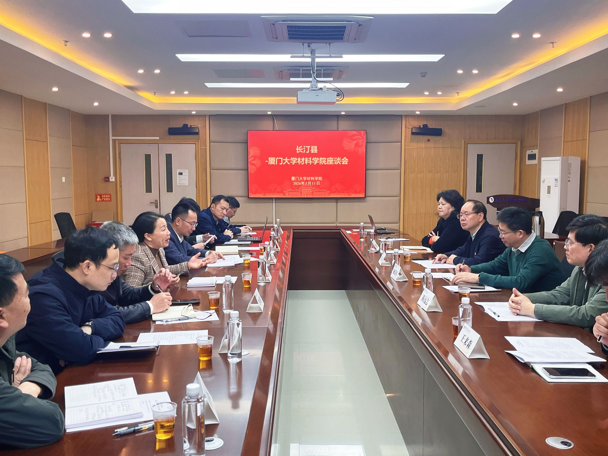 为深入贯彻创新驱动发展战略,推动校地企协同创新,破解新材料产业发展瓶颈,3月11日上午,长汀县人大常委会副主任温梅英、县教育局党组书记林鹏盛带队,联合福建省金龙稀土股份有限公司(以下简称“金龙稀土”)负责人一行,赴厦门大学材料学院开展专题调研,围绕深化产学研融合等事宜,与学院领导、专家学者进行深入座谈交流。