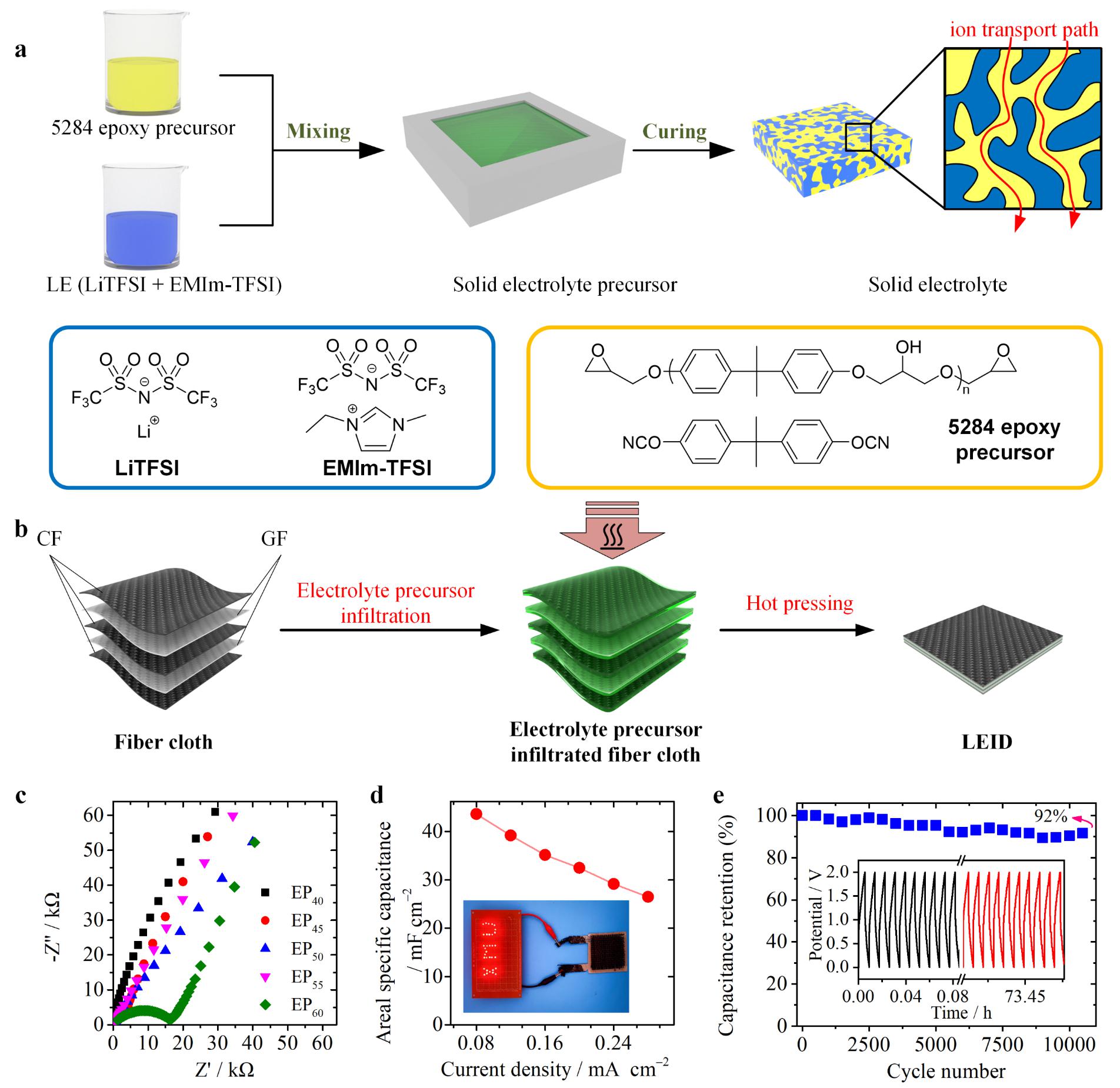承载储能一体化器件(Load bearing/energy storage integrated devices, LEID)又称结构功能一体化材料,是一种同时具有力学承载能力和电化学储能能力的高强度复合材料。如果汽车外壳、底盘等结构部件可以作为电源使用,则能够在不增加专用电源质量和体积的前提下提升系统总能量密度。然而,尽管LEID的概念已经提出了多年,但是兼具高机械性能和电化学性能的器件的报道少之又少,其原因是缺乏高强度固体电解质,且缺乏器件结构和材料层面独特的设计。