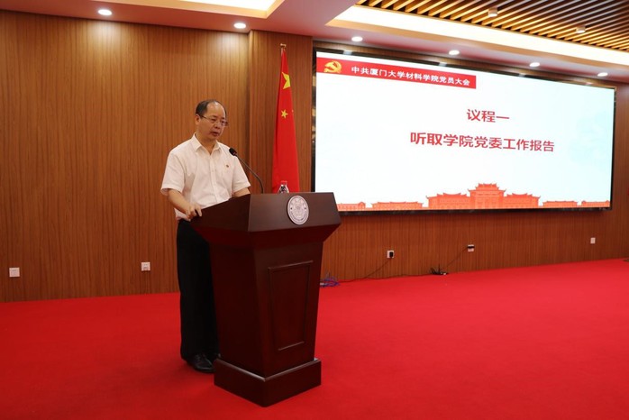 刘立荣代表中共厦门大学材料学院第三届委员会向大会作题为《凝心聚力 踔厉奋发 为推动学院高质量发展而努力奋斗》的工作报告。报告首先从“一个中心”“两个主体”“两支队伍”“四个建设”“服务国家”五个方面对学院过去四年的工作做了总结回顾,提出了到2025年将材料科学与工程学科建设成为国内一流、国际知名学科,学院整体实力和主要办学指标达到国际知名水平的发展目标;并从“党建工作”“人才培养”“科研工作”“人才引进”“国际化水平”“办学条件”六个方面指出了实现目标的思路举措。同时,刘立荣还就本届委员会期间党费收缴、使用、管理情况向全体党员报告。
