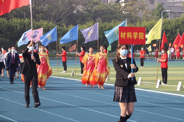 伴随着慷慨激昂的入场式音乐,由各学院师生组成的方阵队伍迈着铿锵有力的步伐走向主席台前,向校领导们展示自己的风采。他们在演武场上洋溢着朝气,展现出独有的青春活力。一时间,演武场就是他们的舞台,校领导和老师同学们就是他们的观众。其中,材料学院方阵的师生代表们步伐整齐,精神抖擞,着装统一,自信地接受检阅。走在队伍前端的是由院党委书记刘立荣、院长彭栋梁领衔的教师代表队伍,他们西装革履,自信昂扬,象征着全院教师要在科学与教学征途上带头冲锋,勇攀高峰,为材院学子树立优秀的榜样。伴随着响亮的口号——“天生我材,料定乾坤,称霸赛场,展我雄风”,材料学院的师生迈着坚定有力的步伐走来,他们挥舞着手中鲜艳的红旗,整齐划一地走着。队首的舞蹈队员们身着红裙,翩翩起舞,她们的舞蹈优雅而有力,展现了材料学院奋勇向上、拼搏协作的团队精神,也表达了对学院未来发展更加“红红火火”的期望。舞蹈结束后主席台上响起了热烈的掌声。
