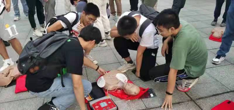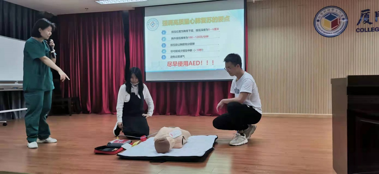 讲座结束后,来自厦门大学附属翔安医院国家临床教学培训示范中心的张莉莉等三位老师还对大家进行了医疗急救培训。培训内容主要包括急救复苏CPR+AED课程和创伤急救。培训老师为大家现场示范了成人心肺复苏,即胸外按压、人工呼吸和使用自动体外除颤仪以及完整操作流程。在老师的指导下,每位学员对“模拟人”进行了一次完整的心肺复苏操作步骤。通过两个多小时的培训,师生们不仅掌握了急救培训的理论知识和实际操作流程,也深刻感受到普及急救知识的重要性和紧迫性。
