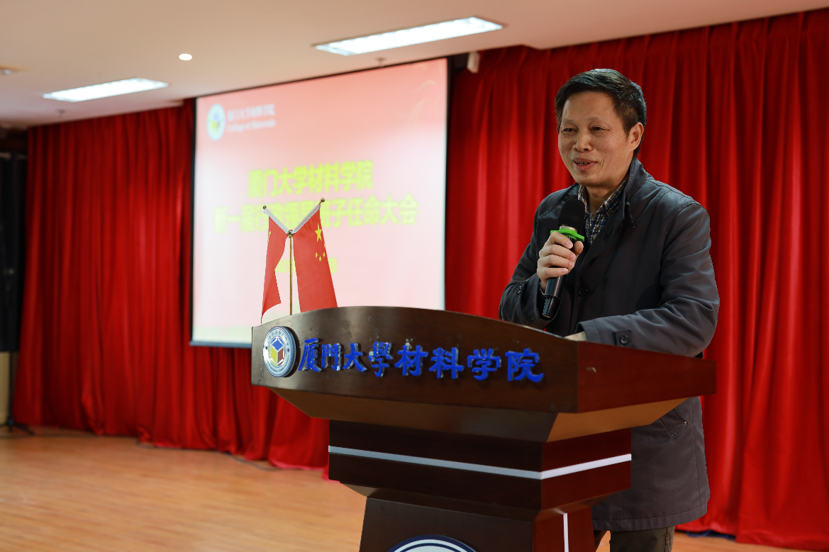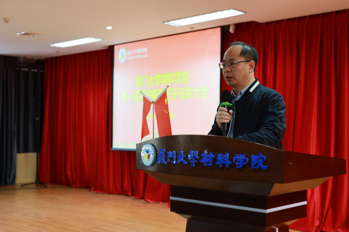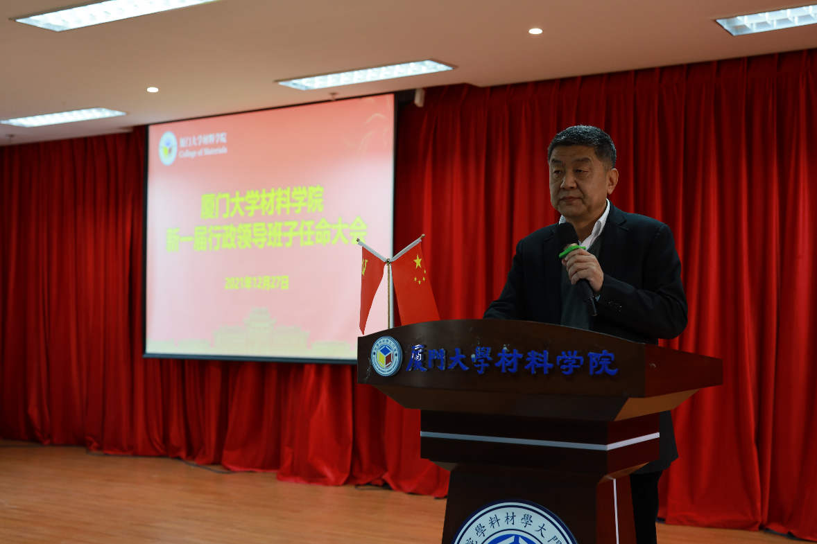 解荣军院长代表新一届行政领导班子作表态发言。他首先感谢学校和广大师生的大力支持和充分信任,他说新一届领导班子使命光荣,责任重大。为此,他代表领导班子做出了四点表态:一是讲政治。始终坚持和拥护党的领导,提高政治素质和政治站位,树立大局观和全局观;二是讲廉政。努力做到廉洁奉公、坚守底线思维、办实事求实效,真正让老师们在材料学院有归属感,能够积极参与材料学科的发展,能共享材料学院发展的成果。三是讲原则。建立健全学院的规章制度,按照规章制度办院,规范办事流程,确保公平公正。四是讲情怀。思考如何成为国家的重要战略科技力量,为党育人,为国育才。五是讲奋斗。分析学院存在的不足,找出差距,把学科建设进一步推向前进,坚持把工程认证作为学院重点工作抓紧抓实;优化学科建设重点,强化战略科技的研发,把材料学院建成为国家重要的战略科技力量;加强人才队伍建设,加强现有青年人才的培育,引进关键重点人才。