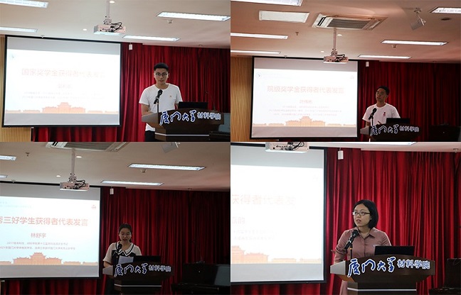 颁奖仪式后,获奖学生代表,2018级硕士生郭利鹏、2019级博士生叶伟彬、2017级本科生林舒宇、2018级本科生张嘉韵分别上台交流发言,他们结合自己的奋斗经历分享学习经验,激励同学们要敢于梦想,乐于坚持,不忘初心,砥砺前行。