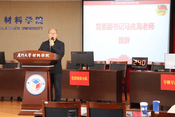 12月23日上午9:00,由共青团厦门大学材料学院委员会主办、材料学院本科生团总支承办、材料学院研究生团总支协办的“材料学院第五届党团知识竞赛”在圣诺楼201举行。院党委副书记马兆海,团委书记石林伟,团委副书记蔡胜男,辅导员林锦昊参加了此次活动。