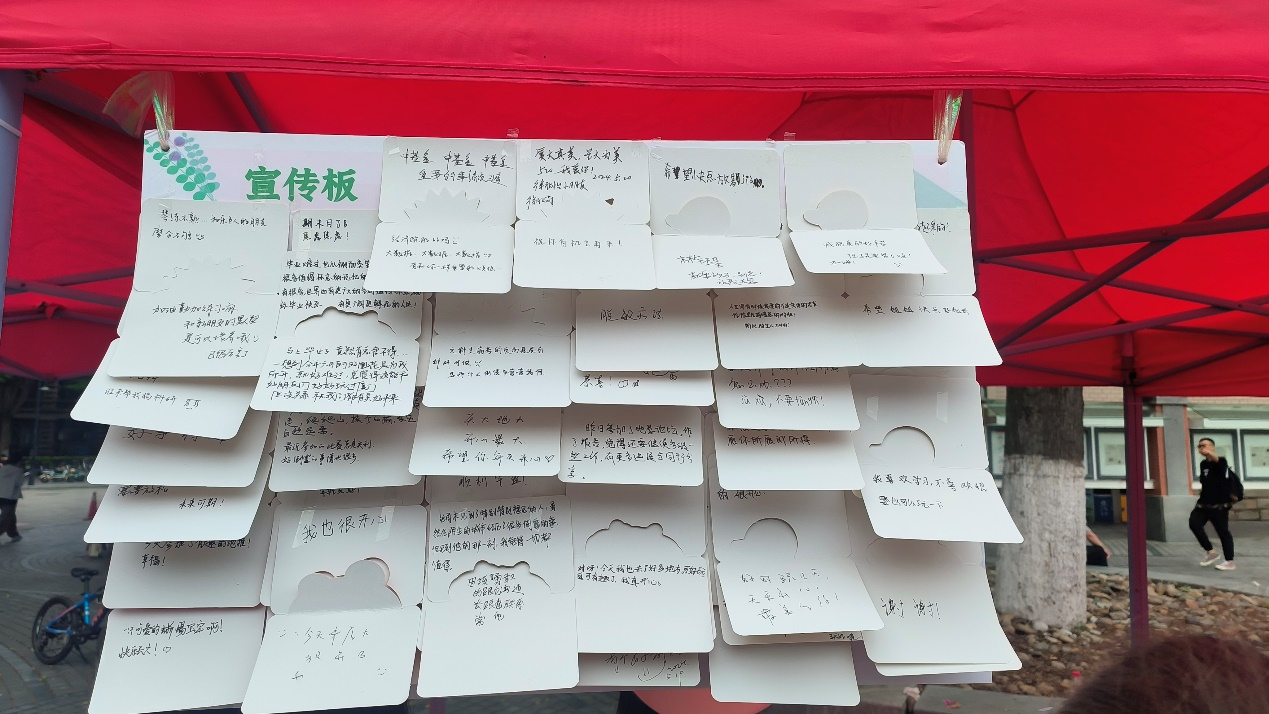 心理树洞成为了参与者们的心灵驿站。参与者们纷纷写下自己近期在人际交往中遇到的困惑、科研压力,或者是生活中的开心事,将这些心情故事投入“心理树洞”箱子中。随后,他们从箱子中随机抽取一张他人的贺卡,写下自己的建议、鼓励或祝福,再将这份心意粘贴在宣传板上。