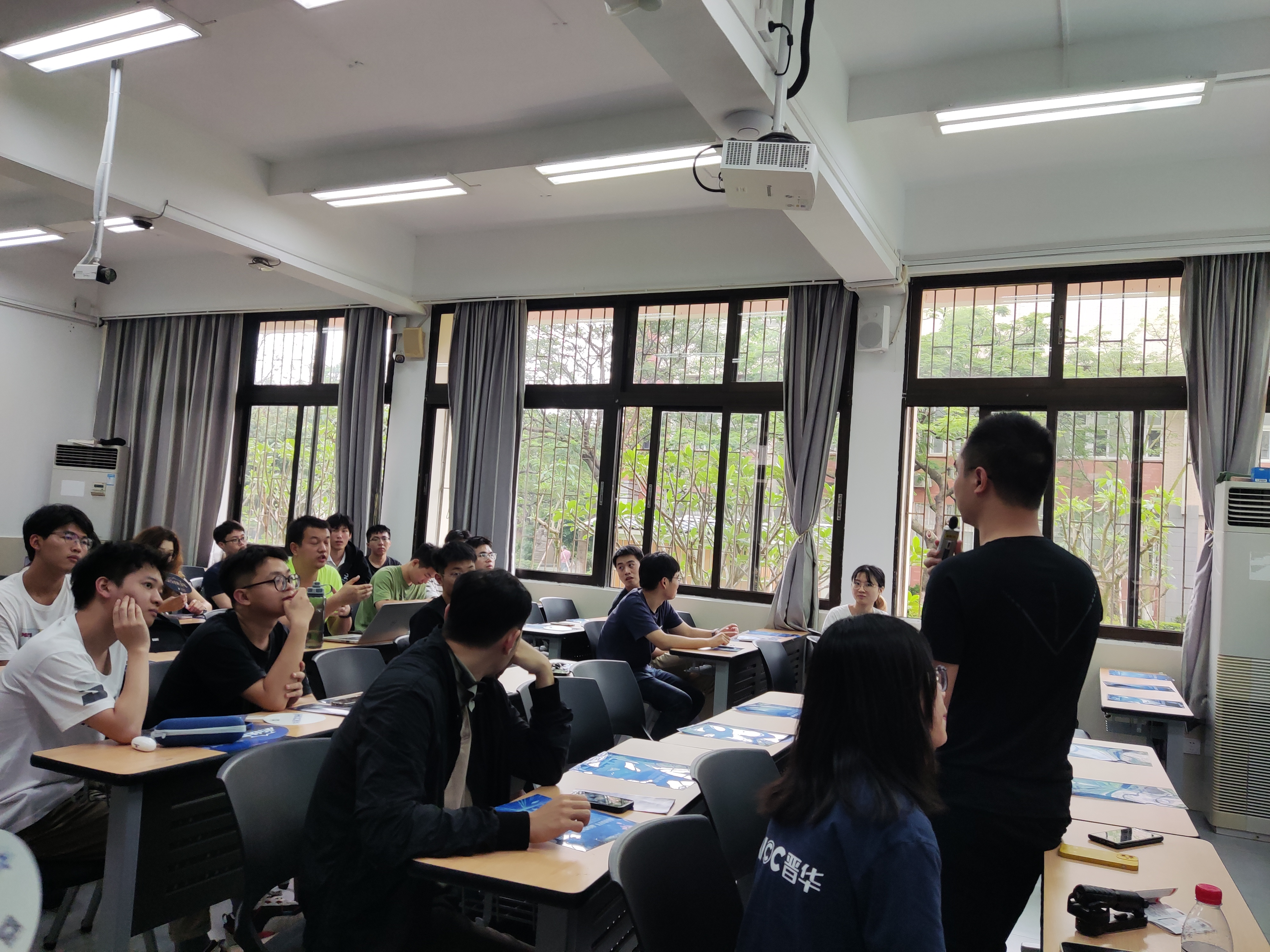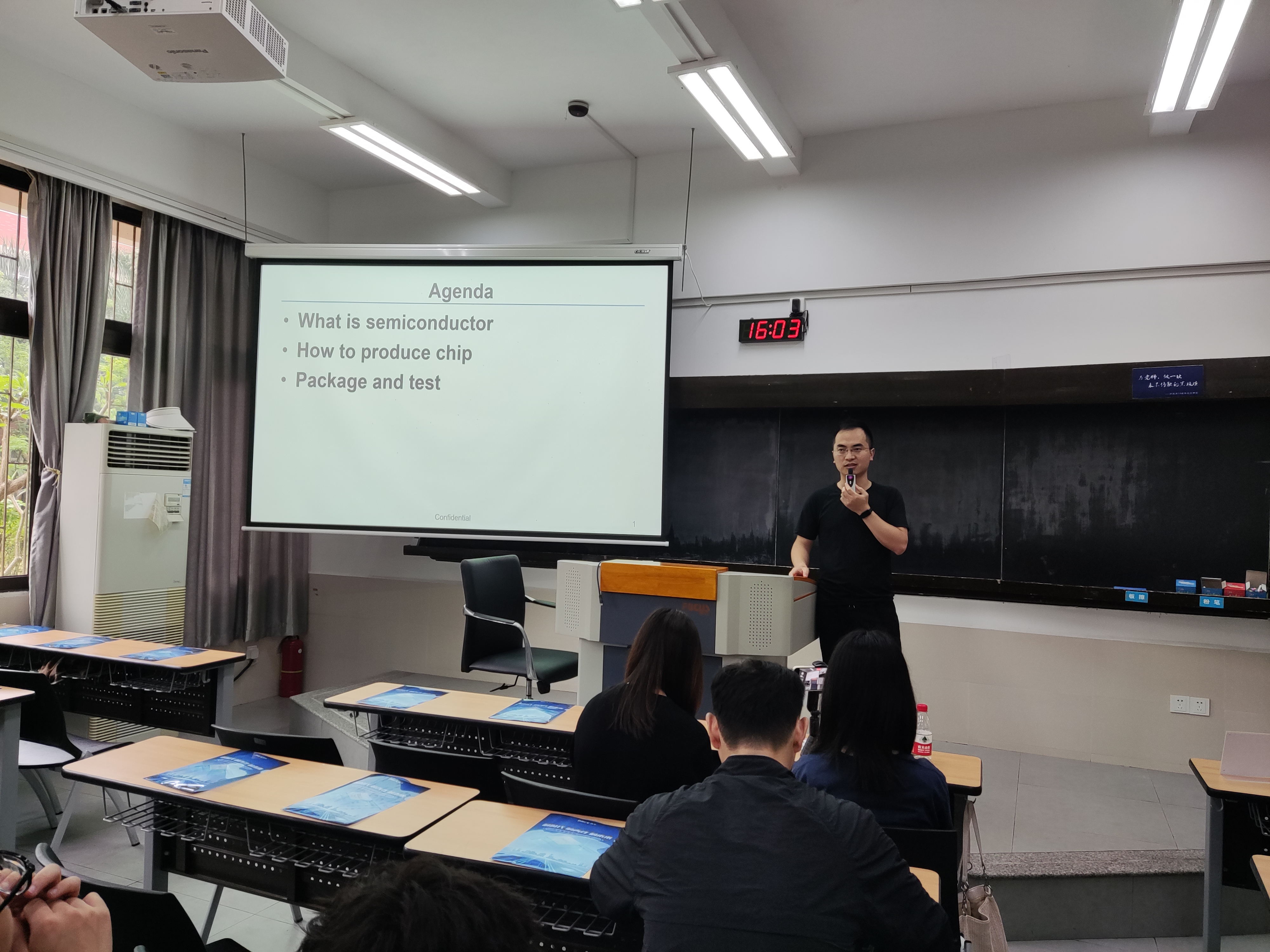 紧接着,材料学院2019届博士毕业生赖惠先详细讲解了半导体的概念、芯片生产的工艺流程、芯片的封装和测试。赖惠先从材料专业出发,以一名高级工程师的角度,结合图解和视频,生动有趣地呈现了逐层制造芯片的过程,为同学们打开了芯片制造的大门。