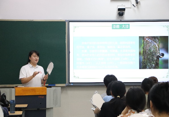 活动开始,朱天然老师向同学们介绍了漆扇的演变过程、制作工艺、主要材料大漆的成分及特点,让同学们了解漆扇,发现漆扇背后丰富的文化内涵。接着,朱老师向同学们讲述了本次活动漆扇的制作方法,同时向大家介绍了本次活动用到的扇子。团扇、芭蕉、美人……每种扇子都有独特的寓意,也代表了中华优秀传统文化丰富的表现形式。