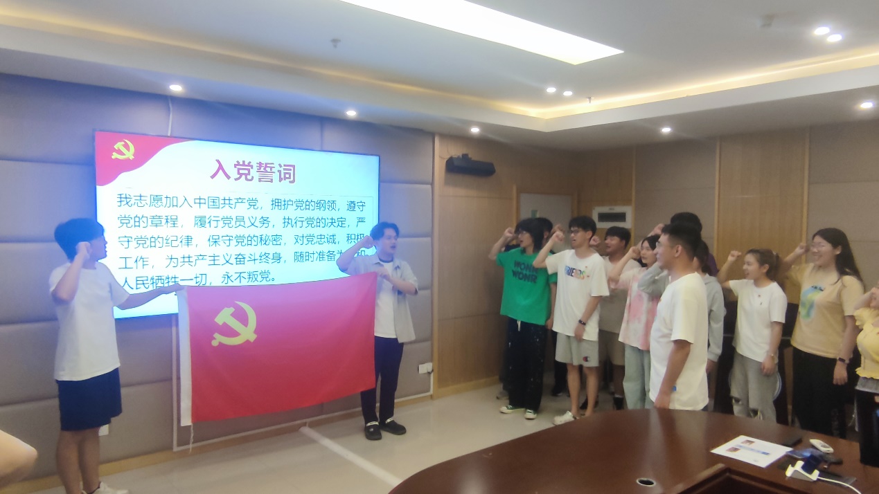 重温入党誓词,坚守初心使命。支部党员曹嘉宏带领全体党员重温入党誓词。在党旗下,高举右拳,誓言铿锵有力,表达了对党的无限忠诚和坚定信念。希望党员同志能够牢记铮铮誓言,牢记职责使命,毕业生更要在未来各自的岗位上发光发热。