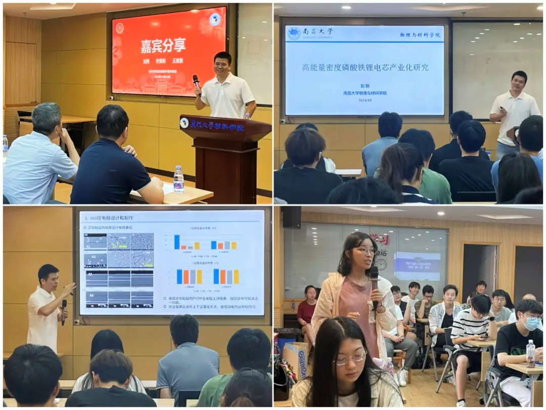校友刘翔副教授以其在高能量密度锂电芯领域的产业化研究为切入点,分享了厚电极设计和硅碳负极制备的最新进展,随后他还分享了自身丰富的教育和工作与科研心得。作为南昌大学的年轻教师,刘翔副教授介绍了服务单位的办学条件和师资力量,鼓励同学们继续深造,扎实科研,期待能与母校有更多的合作交流。最后他给本科生同学分享关于保研后的规划秘诀,告诫同学们发挥自身的主观能动性是年轻人最大的优势,要争做能吃苦、肯奋斗的优秀青年,多做实验,多总结经验,多问为什么,多想怎么做。他的丰富经历和精彩分享获得了同学们的热烈掌声,为在校生特别是面临抉择的毕业班同学们指点了迷津。