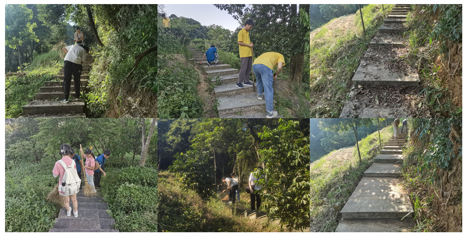 在康养基地,实践队员们多次参加了清理登山步道的活动。手持长柄镰刀和竹制扫帚,队员们分工明确,有条不紊地展开清理工作。步道两旁藤蔓交错,部分阶梯被厚厚的落叶覆盖,显得阴暗潮湿。队员们挥动长柄镰刀,割除覆盖在阶梯侧的杂草,这些杂草顽强地生长,攀附在阶梯边缘,有的甚至从缝隙中钻出,展现出惊人的生命力。对于难以割除的小株植被,队员们不辞辛劳,一一拔除,确保每一级阶梯都能露出本来的面貌。竹制扫帚轻快地挥动,将积存的落叶一扫而尽。经过一番努力,原本被杂草和落叶掩盖的步道变得清晰可见,阳光透过树叶的缝隙洒在干净的阶梯上,显得格外明亮。