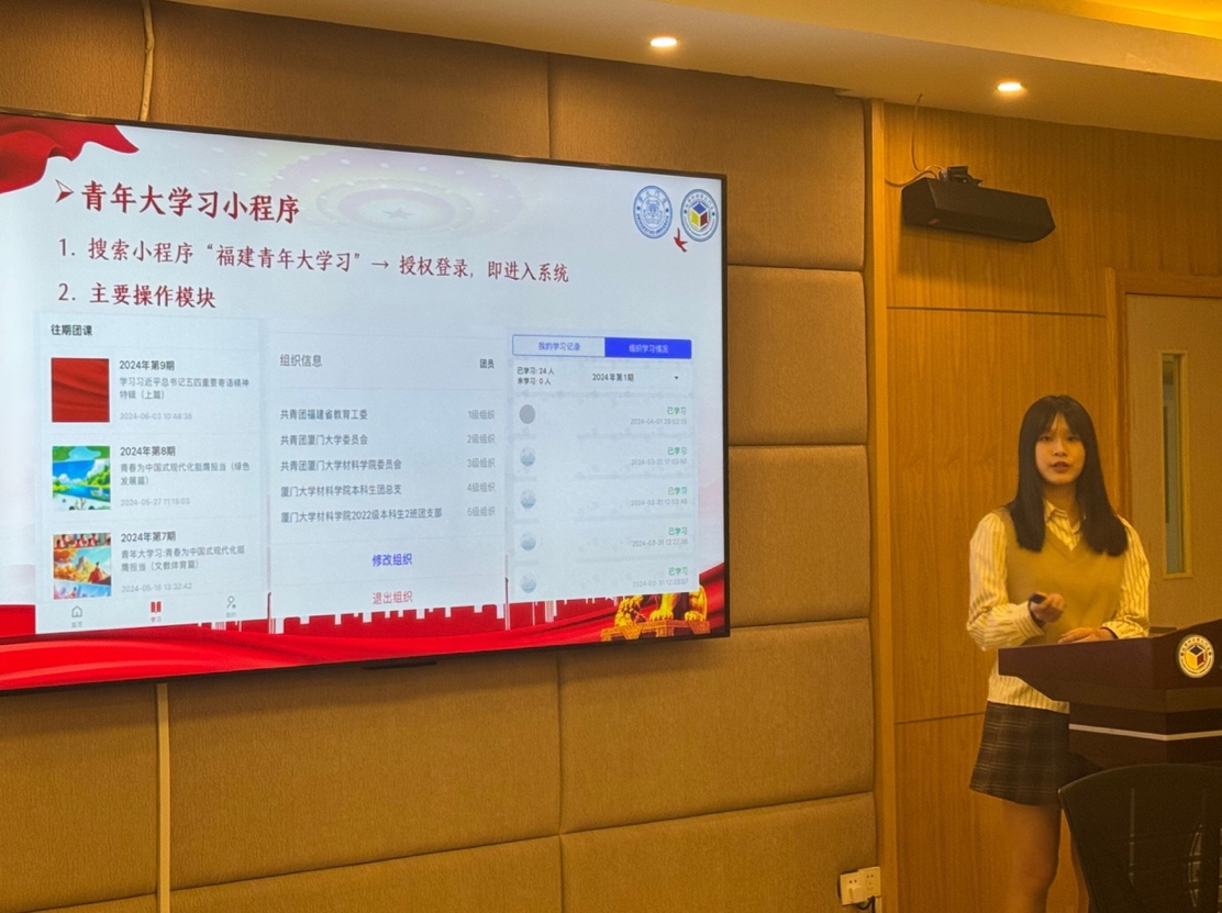 会议第二项,2022级团支书张嘉雪和田欣平结合过往工作经验,介绍智慧团建系统和开展主题活动的主要操作方法。同时,阐述了团支书的基本工作内容和要求,讲解了组织生活会和年度教育评议的具体流程与相关任务,并强调了星级团支部建设要求,为团支书们今后使用系统和开展主题活动提供了清晰的思路和方法。