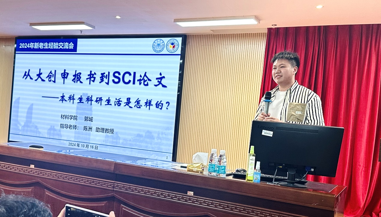 为进一步推进学院学风建设工作,引导新生更好适应大学生活,增强学院新老生之间联系和凝聚力,10月16日晚上在圣诺楼201开展了材料学院新老生经验交流会。辅导员林锦昊老师主持本次大会。2021级本科生黄蕊、郭城、2023级本科生郭堃煌进行经验分享,他们通过树立榜样,引导2024级新生探索个性化的学习路径与目标,现场解答新生疑惑,以学长学姐的亲身经历激发学习动力,通过朋辈间的相互启发,营造积极向上的学习氛围。