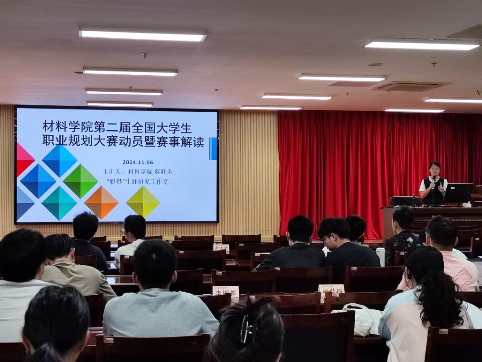 11月6日下午,材料学院第二届全国大学生职业规划大赛动员暨参赛指导会在材料学院圣诺楼201报告厅举行,学院团委副书记蔡胜男老师为同学们做报告。