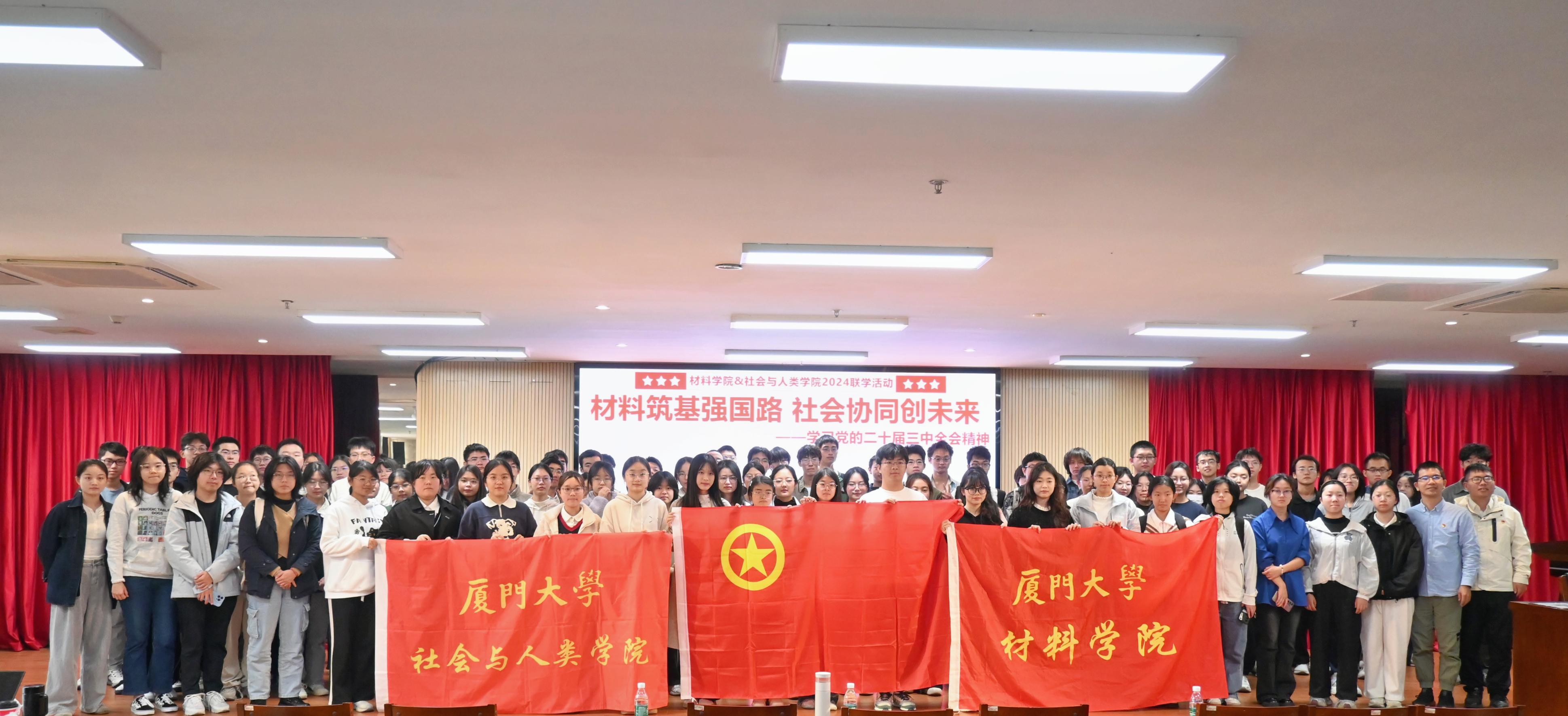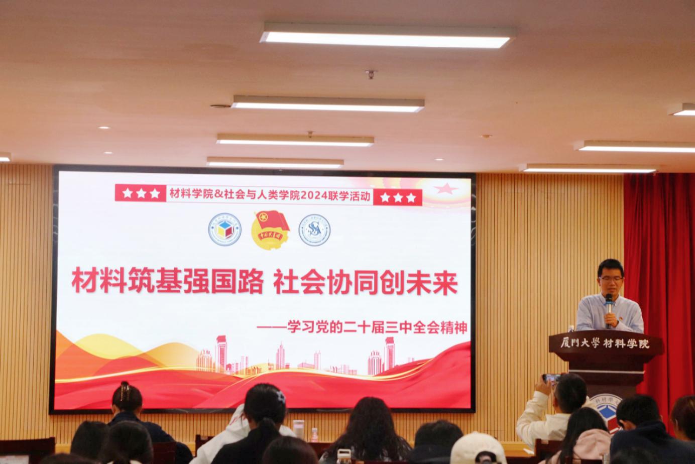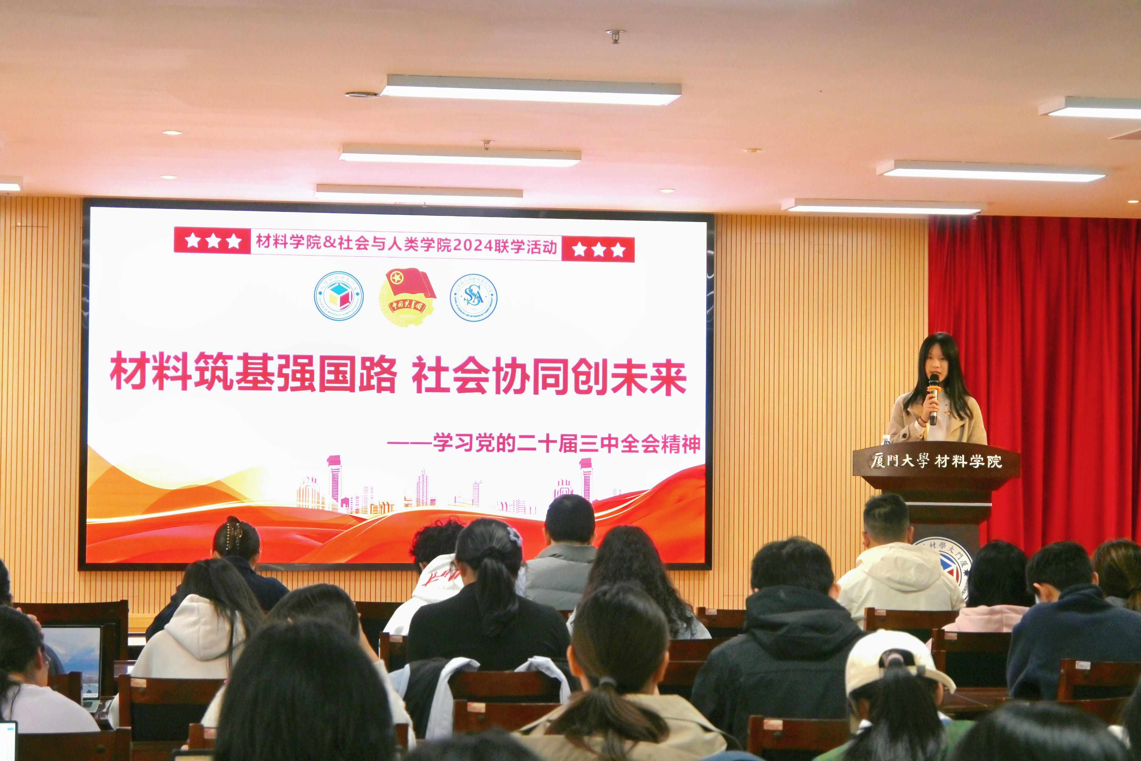 为深入学习贯彻党的二十届三中全会精神,探讨新时代青年在强国建设与民族复兴中的使命担当, 12月13日,材料学院与社会与人类学院在圣诺楼201教室联合举办了以“材料筑基强国路,社会协同创未来——学习党的二十届三中全会精神”为主题的团课教育联学活动。材料学院团委书记石林伟、辅导员林锦昊,社会与人类学院辅导员黄诗玲以及两院学生代表参加活动,材料学院本科生团总支书记张嘉雪主持活动。
