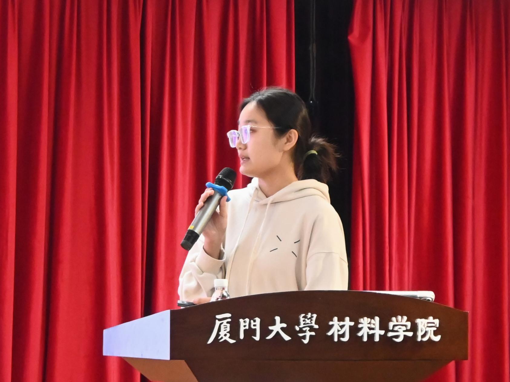 材料学院新生团支书代表陈书逸带来了主题团课《青春筑梦新征程,协同奋进创未来》。她结合自身学习与实践经历,讲述新时代青年如何以梦想为舟、以奋斗为桨,在协同创新中开辟属于自己的青春新天地,勇敢逐梦新征程。她的发言情感真挚、激情洋溢,激发了在场师生的共鸣与热情。