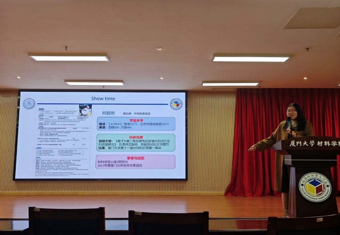 为加强学风建设,发挥朋辈导师示范引领作用,帮助学生提前做好升学准备,材料学院于3月9日在圣诺楼201顺利举办保研经验分享会。分享会邀请了5位材料学院2021级优秀本科生,分别是郭城(保研至清华大学)、黄蕊(保研至上海交通大学)、陈鑫杰(保研至南开大学)、阿路思(保研至哈尔滨工业大学)、闫榕培(保研至厦门大学)。五位分享同学向大家传授自己的“保研秘籍”,各年级本科生共100多人参与活动。