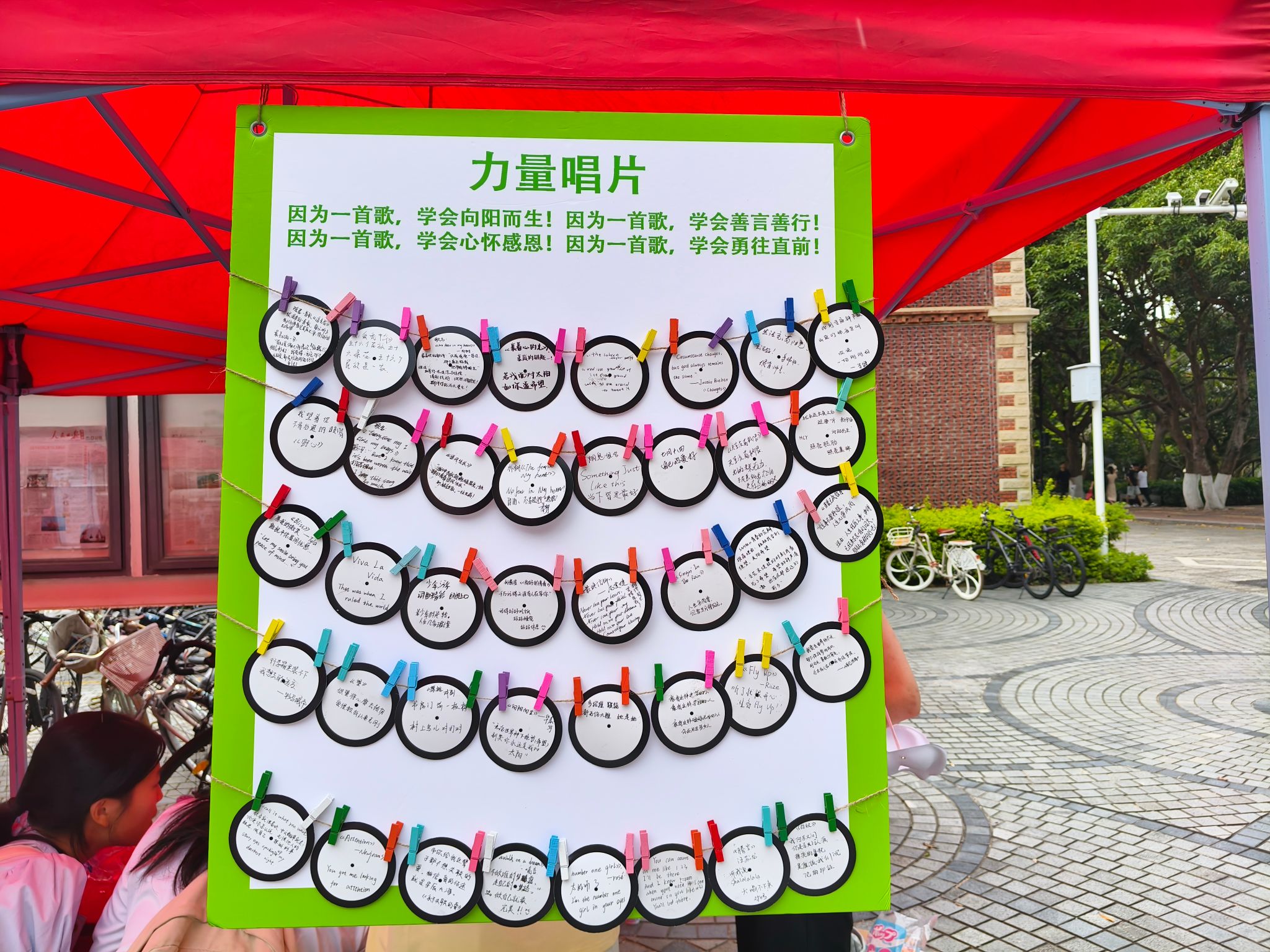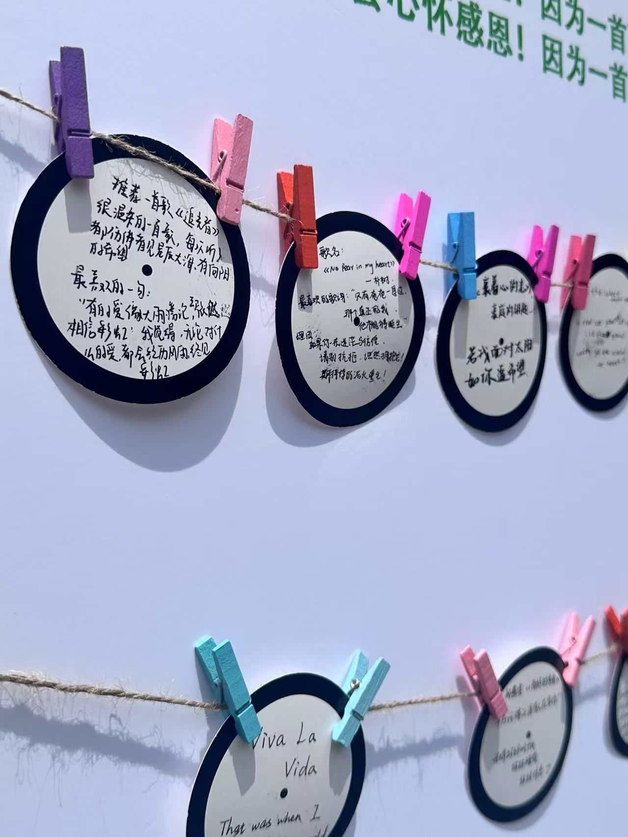 “每当我听到这首歌,就觉得充满力量!”在力量唱片区,同学们热情分享着自己的“心灵BGM”。从经典老歌到流行金曲,从激昂摇滚到温柔民谣,每一张唱片卡片都承载着独特的情感记忆。不少同学表示,通过这个环节发现了许多“宝藏歌曲”,也感受到了音乐带来的心灵共鸣。