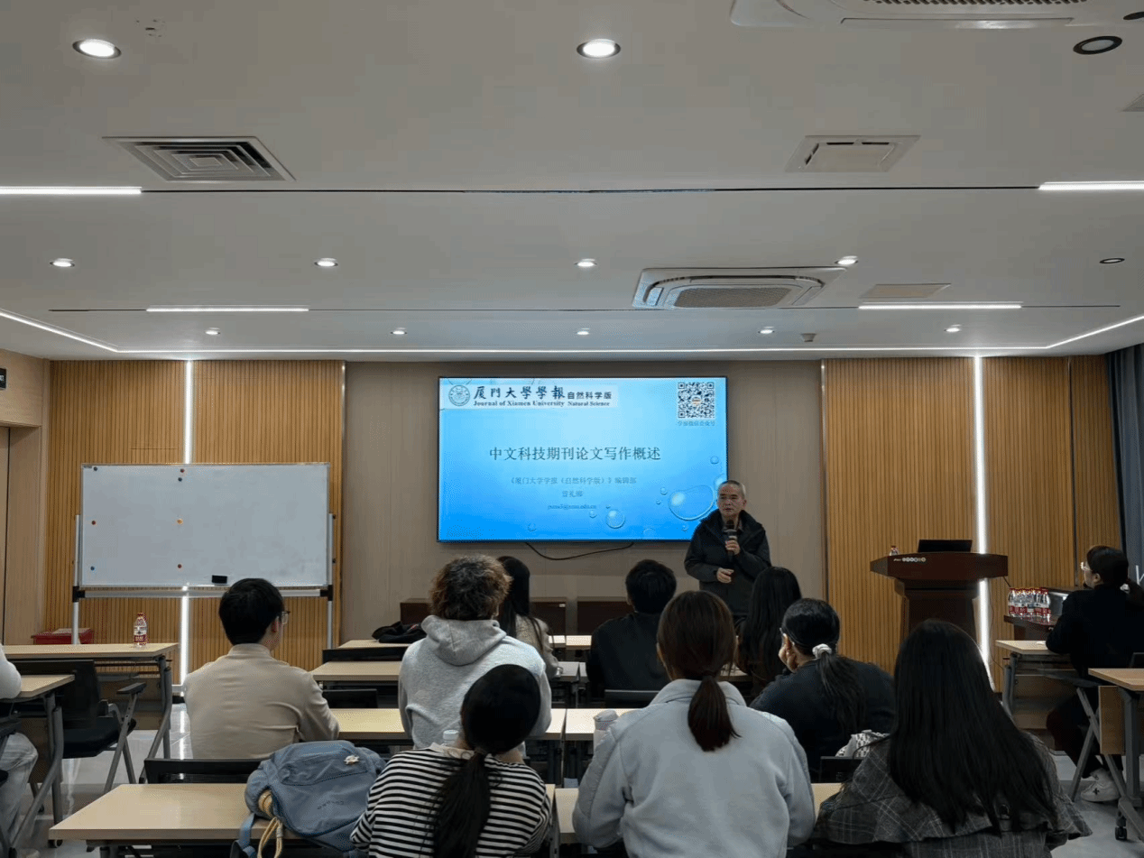 讲座伊始,邱仲潘副主任对《厦门大学学报(自然科学版)》编辑部长期坚持走进学院、面向学生开展学术写作指导的优良传统作出介绍,并指出论文写作能力对科研训练和学术发展具有基础性意义。随后,曾礼娜编辑结合多年期刊编辑与稿件审理经验,从编辑视角系统讲解了中文科技论文写作中的关键问题。