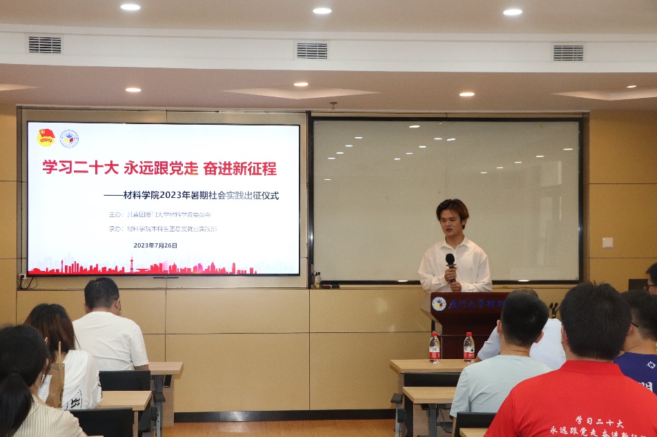 7月26日,材料学院举办2023年暑期社会实践动员暨出征仪式,学院党委副书记马兆海,团委书记石林伟,辅导员林锦昊以及各实践团队成员参加。