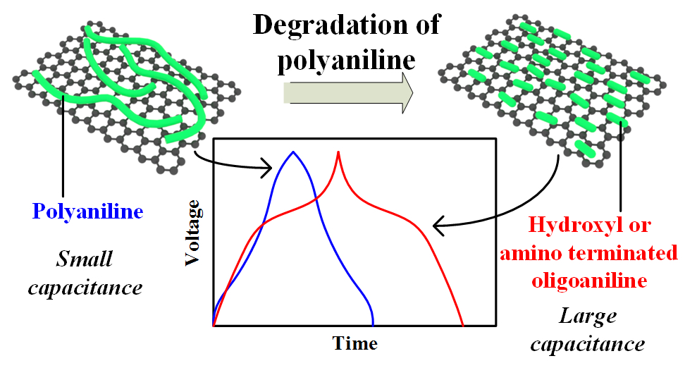 PANI/RGO复合电极材料由于其高比电容量和优异的倍率性能,在超级电容器上得到了广泛的应用。但是,人们对此类材料中PANI和RGO所扮演的角色还不清楚。通常认为,在复合材料中RGO可以引入有利的微观结构,提高电极的导电性,并为PANI的氧化还原中体积变化提供的缓冲空间,从而提高材料的倍率性能,减少等效串联电阻,延长电极的循环寿命。然而,令人费解的是,在大量的文献报道中,PANI(理论电容量740 F/g)与RGO(实测电容量220 F/g)复合后得到的材料的电容量可以远远超出计算出的理论比电容,通常可达800 F/g以上。研究者们通常把这种超高电容性能简单归因于高电容的PANI和RGO材料之间的协同效应,这反应出人们并没有真正的理解PANI/RGO电极材料的电化学工作机理。