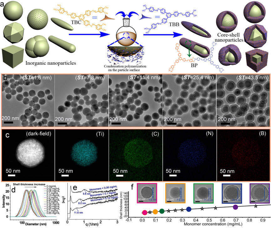 图1. 硼酸酯聚合物在无机纳米材料表面可控包覆过程及厚度调控/预测。