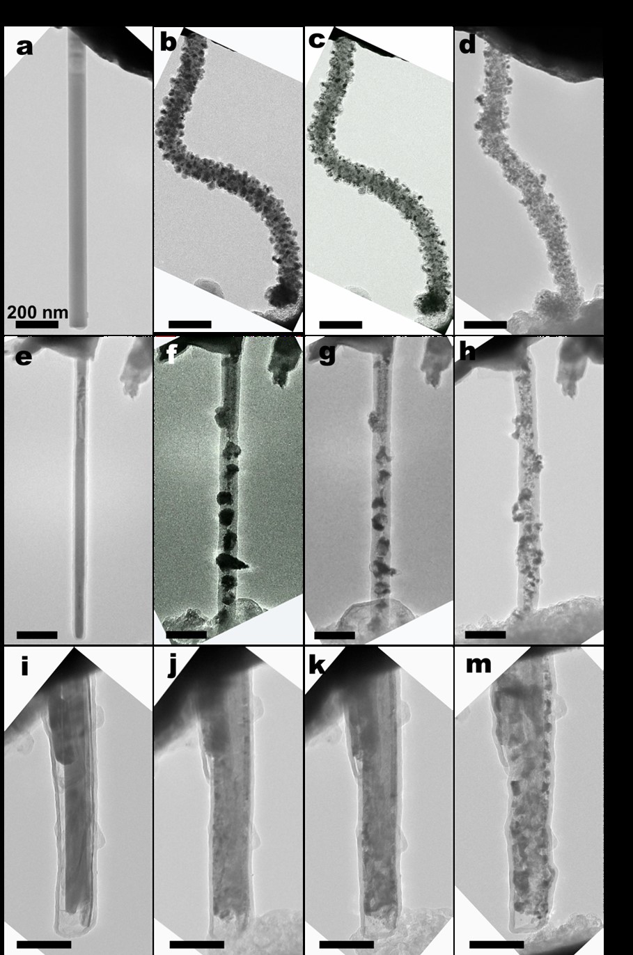 图2 单根Bi2S3纳米线(a)初始、(b)一圈循环后、(c)两圈循环后、(d)多圈循环后;单根core@shell Bi2S3@C纳米线(e)初始、(f)一圈循环后、(g)两圈循环后、(h)多圈循环后;单根yolk@shell Bi2S3@C纳米线(i)初始、(j)一圈循环后、(k)两圈循环后、(m)多圈循环后的原位TEM照片。