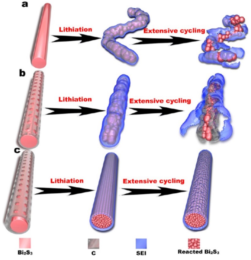 图1 各种基于Bi2S3的负极的锂化过程和循环示意图。(a)单纯的Bi2S3纳米线,(b)core@shell Bi2S3@C纳米线,(c)yolk@shell Bi2S3@C纳米线。氮掺杂介孔碳外壳和中空空间的结构特性可有助于减轻电化学诱导的机械降解,提高循环稳定性。但单纯的Bi2S3纳米线和core@shell Bi2S3@C纳米线在循环过程中很容易发生活性物质和SEI膜的机械降解。