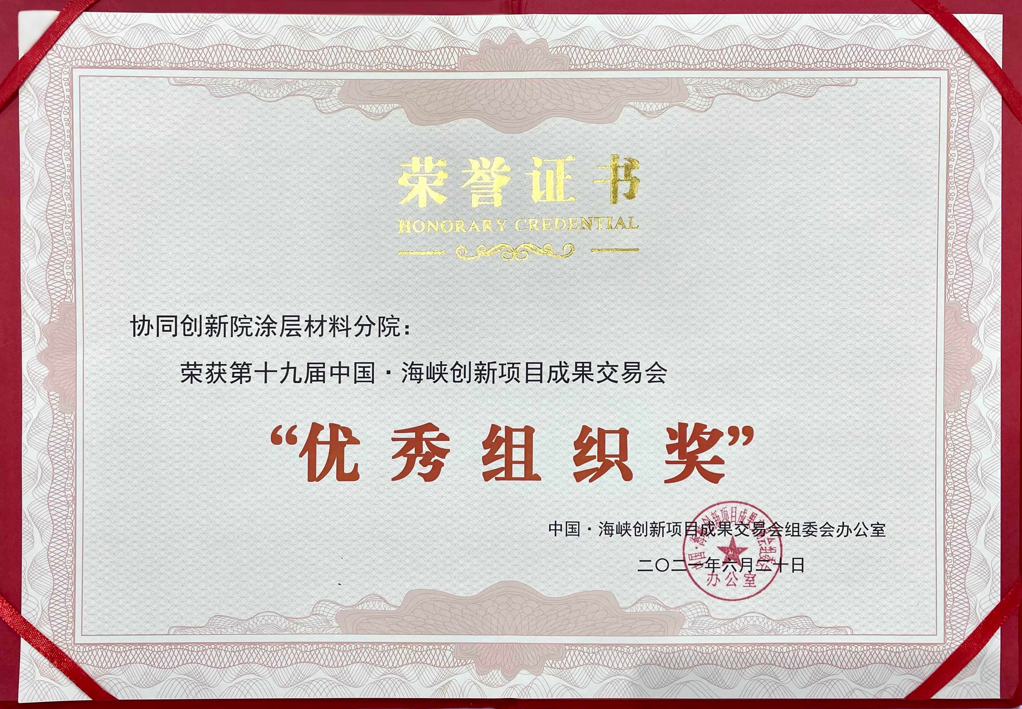 涂层材料分院在“海创会”上表现突出,被中国·海峡创新项目成果交易会组委会授予“优秀组织奖”。
